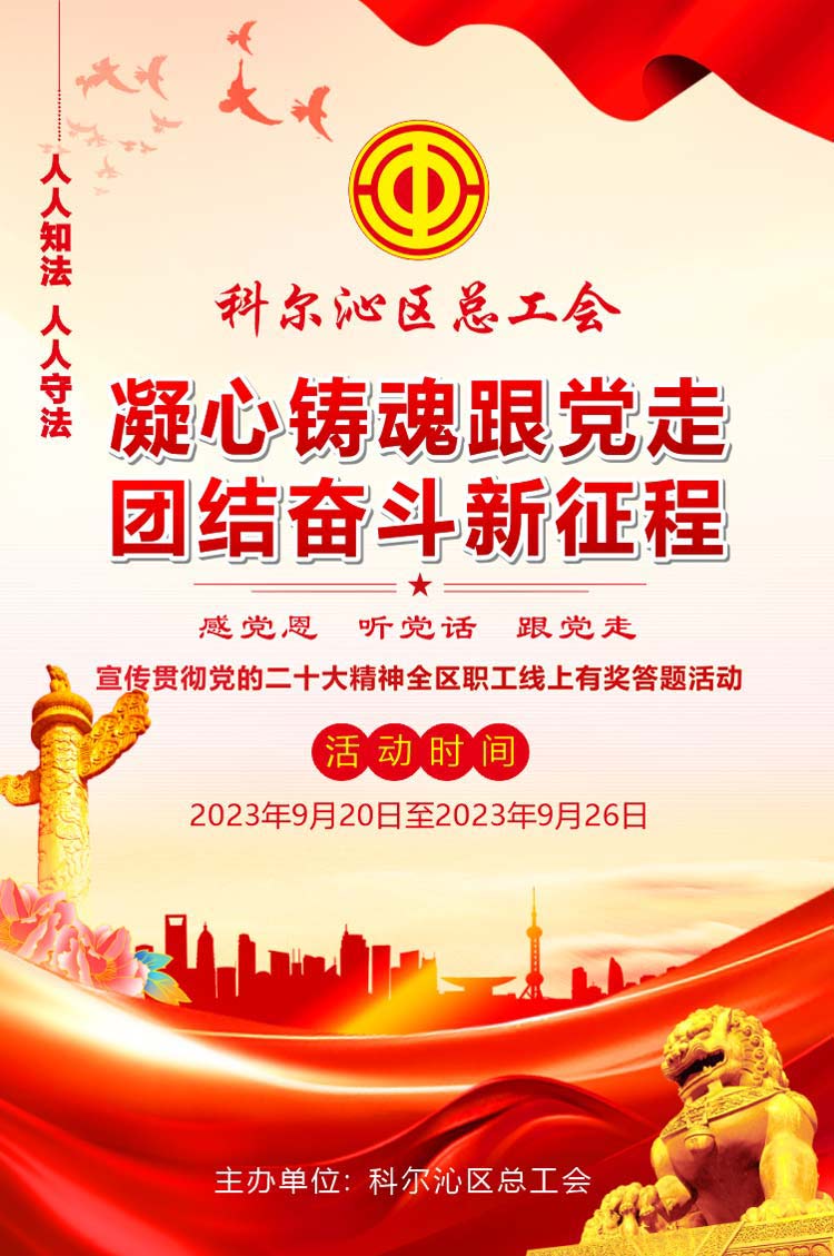 為進(jìn)一步學(xué)習(xí)貫徹落實黨的二十大精神,教育引領(lǐng)廣大職工“感黨恩、聽黨話、跟黨走”,凝心聚力完成“五大任務(wù)”,全方位建設(shè)模范自治區(qū),提升廣大職工學(xué)法、知法、守法意識,形成“人人皆知、人人有責(zé)”的良好法治氛圍,科爾沁區(qū)總工會決定開展“凝心鑄魂跟黨走 團(tuán)結(jié)奮斗新征程”宣傳貫徹黨的二十大精神暨全區(qū)職工線上有獎答題活動。